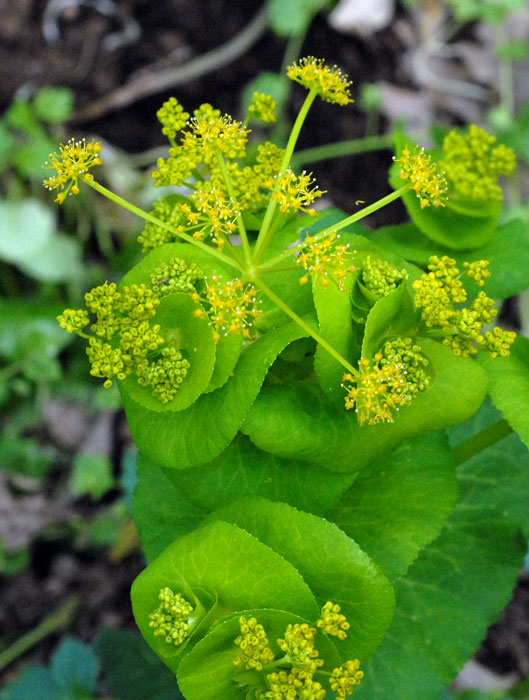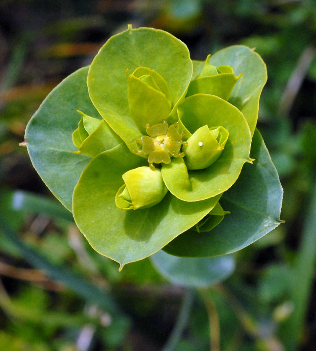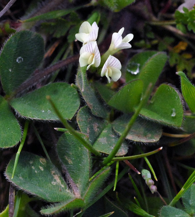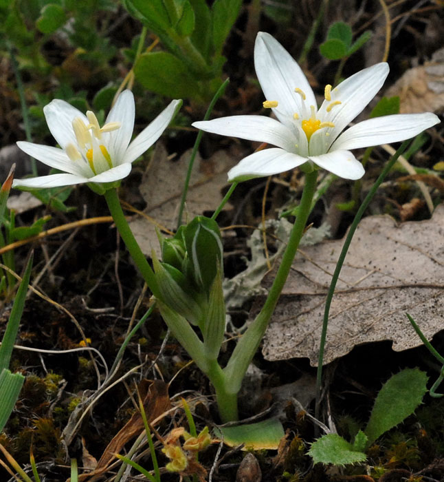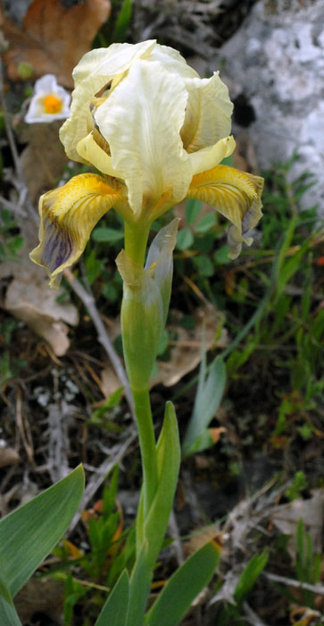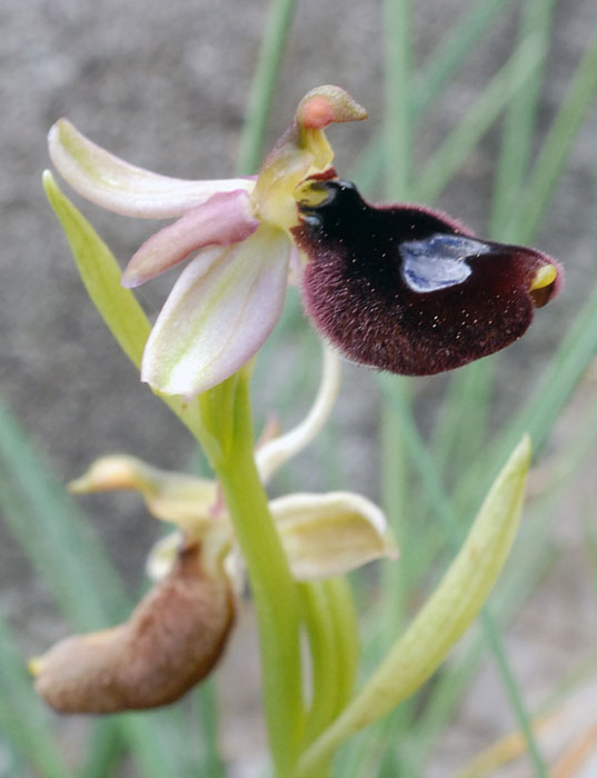 It clouded over a little but as we climbed back up the hill to our vehicles we came across an open hillside similar to the ones we had seen the day before. It was full of botanical treasures and almost immediately we found the uncommon Ophrys bertoloniformis (No English name) which in my photograph looks like a cross between a flying duck and legless tarantula. Also on the hillside were Ornithogallum montanum (No English name), large numbers of Iris lutescens (No English name) including some pale yellow ones, Euphorbium myrsinites (Broad-leaved Glaucous Spurge), Trifolium subterraneum (Burrowing Clover) and Helianthemum apenninum (White Rockrose). Just before arriving back we found a Smyrnium species. This was probably Smyrnium rotunda but I'm not absolutely sure never having seen this before and it is very similar to Smyrnium perfoliatum. Both are related to Alexanders (Smyrnium olusatrum) the common seaside umbellifer which flowers in very early spring in Britain with huge umbelliferous greeny-yellow flowers.