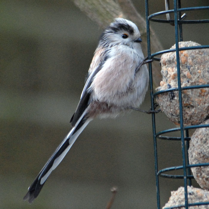 This beautiful and graceful little bird can be heard all year round but is hard to see in the summer when groups of them flit quickly between the trees and bushes. This is known to be their habit - they defend their territory against other groups of Long-tailed Tits. They are insectivorous birds when they can be but in winter when food is scarce we see them best on the feeders as above. Often there will be three or more birds on one feeder.