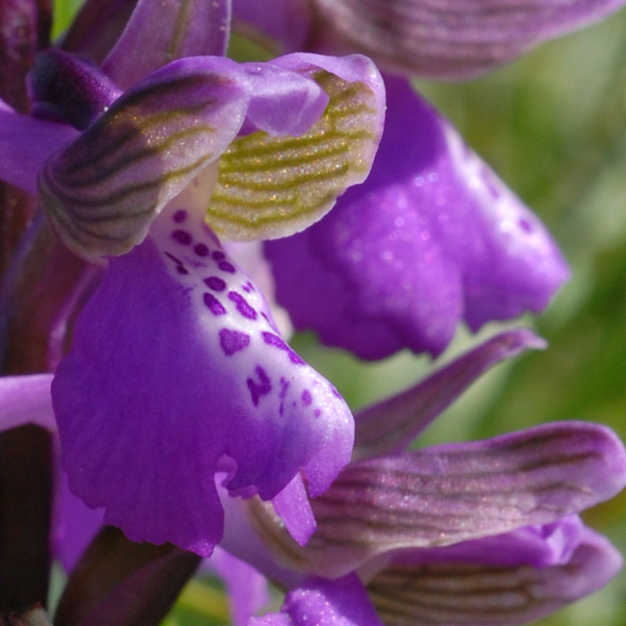 The green "wings" of Anacamptis morio aren't always obvious but in a few of the plants you can usually see at least hint of green even when the rich purple dominates the flower. You have to look carefully on a site where Anacamptis morio grows along side the variable Orchis mascula (Early-purple Orchid) which can be similarly coloured although normally a lot taller.