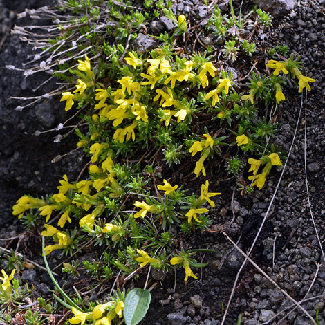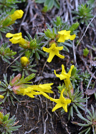 Cushions of this low growing alpine would be covered in blooms hiding the grey green rosettes of linear leaves when the sun shines but it was a bit dull on the day we saw it. The name has changed quite often and it has been variously been known as Douglasii vitaliana, Androsace primuliflora and even now The Plant List says it is correctly written as Vitaliana primuliflora while Tela Botanica says Androsace vitaliana.