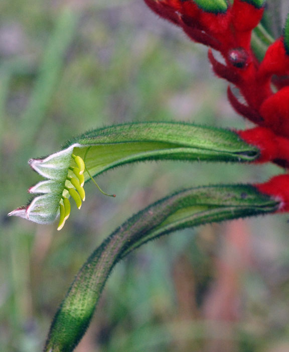 This one is most often pollinated by a Honey eater: Anthochaera carunculata (The Red Wattlebird) which is slightly too heavy for the plant. The bird, seeking nectar a long way down the green tubular petals, causes the stem to bend and as it does the rake like anthers (the "paw") deposit pollen on the birds back or head. When it visits the next plant the pollen is deposited on the small green stigma which you can see in the RHS photo and in the enlarged side view (thumbnail below).