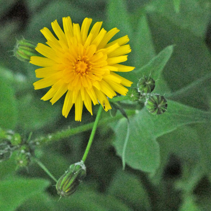 The flowers of this species look like many of the yellow daisies in Asteraceae but the pinnate leaves which can be very large, are quite distinctive. The leaves look slightly like the lower basal leaves of Chicory (Cichorium intybus) which is roughly how the name was first suggested: Apo (= different in Greek) plus seris (=Chicory). The foetida refers to the unpleasant smelling juice.