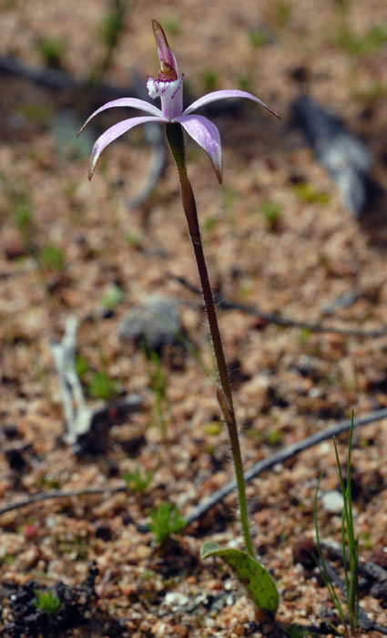 This genus (Caladenia) is named after the word calos (beautiful) and aden (glands). Glands are present on most species but in addition to the usual single hairy leaf which is typical of this terrestial genus of orchid, the stem and even part of the flower is quite hairy. These orchids can grow in clumps possibly because that's where the seeds fall and the ground nearby has the right kind of microrhizal fungus usually needed for germination.