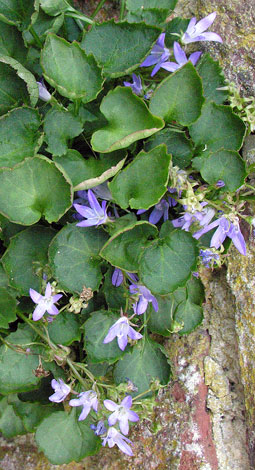 This introduction from the Balkan region is the commonest garden escape of two campanulas often found on walls. The other one Campanula poscharskyana (Trailing Bellflower) has larger star shaped, largely flat flowers where these are distinctly bell-shaped.
