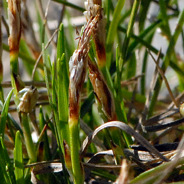 This is an early flowering sedge which occurs in tufts in the limestone areas of a few places in the south of England. It can be quite abundant locally but overall has a restricted distribution. The leaves become channelled as they get older and the tuft is full of dead remnants of the previous years growth. As its name suggests it is a small sedge with the flowering spikes no more than a few centimetres tall.
