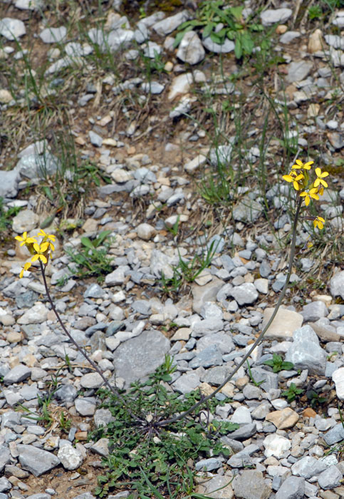 Fortunately the English remains unsullied by taxonomic meddling as Wallflower Cabbage. The stony patch of land on which we found this plant was populated by many looking exactly the same as each other with distinctive pinnate basal leaves and yellow "Wallflower" type flowers. The introduced species which can be found in the British Isles doesn't usually look much like this perhaps because it grows at lower altitudes and often on richer soil.