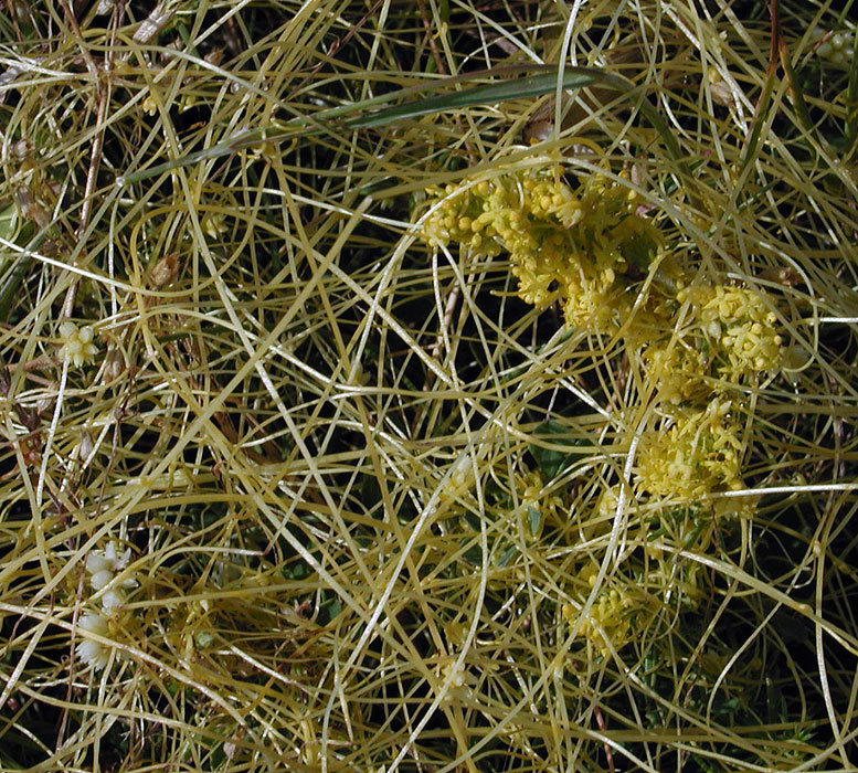 This native parasitic plant is found quite often on a Gorse host as this one was. Its flowers are significantly larger than C. campestris and the stems are red. However you can sometimes find Cuscuta epithymum which lacks the red colour according to the Societe Guernaise and that form has yellow stems not entirely unlike C. campestris. The large photo (thumbnail below) shows the yellow form parisitising Galium verum (Lady's-bedstraw).