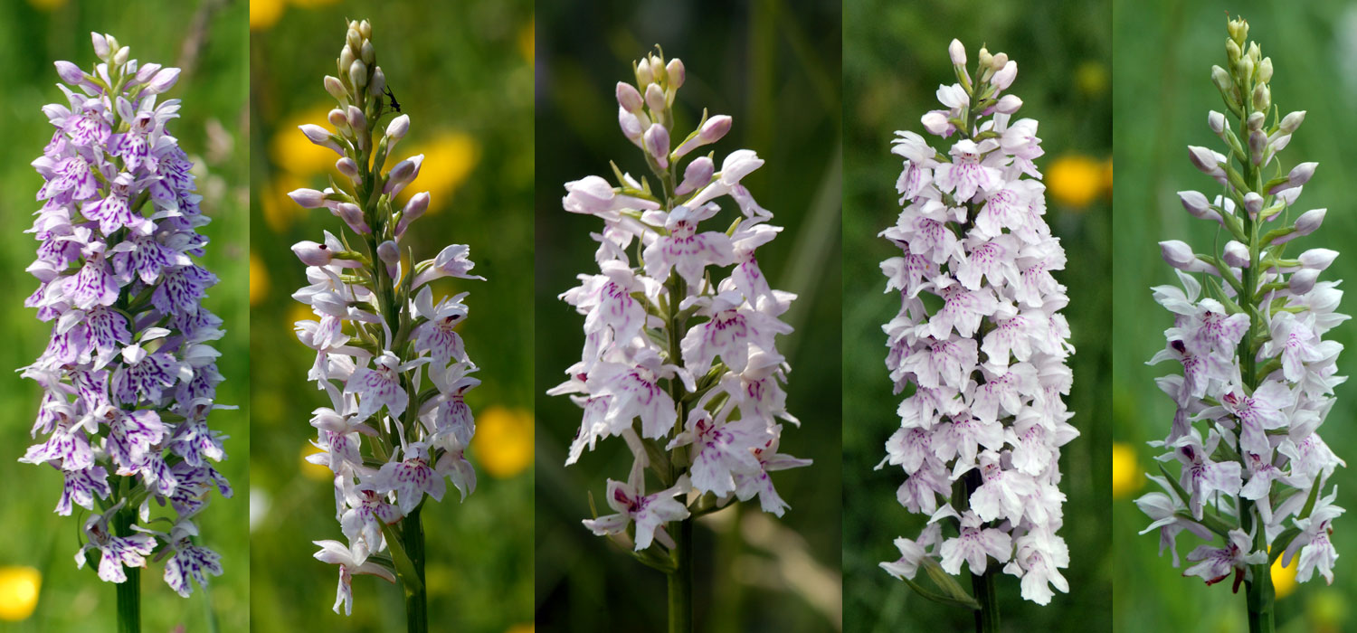 2013: There were ninety-five orchids flowering in my wild garden on 26th June 2013 and one of the interesting things is that the markings on the labellum vary so much. Most are distinctly purple with a white background like the one on the extreme left of the panorama composite photo but many are very pale. On some plants the spots on the leaves are distinct but in other plants they look washed out. A panorama of flowering spikes all taken on the same day in 2013 has been added below.
