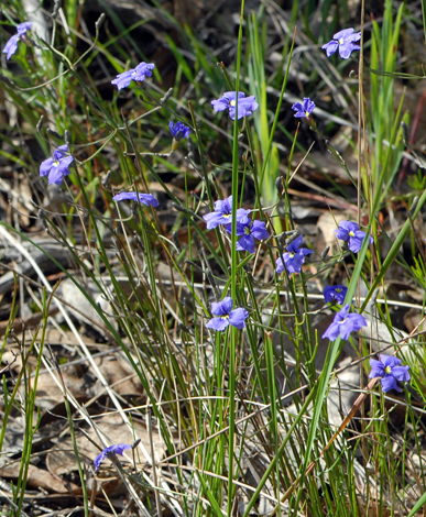 This is a tallish plant for this genus with stems up to 0.5 metres in height. Sometimes the stems arch over but the "Pouched" description arises because of a small swelling behind the flower head due to the single growing seed in the ovary. Dampiera species are quite plentiful in the far south west of Australia as they prefer damp conditions and are often found on roadside verges where there is more likely to be disturbed ground.