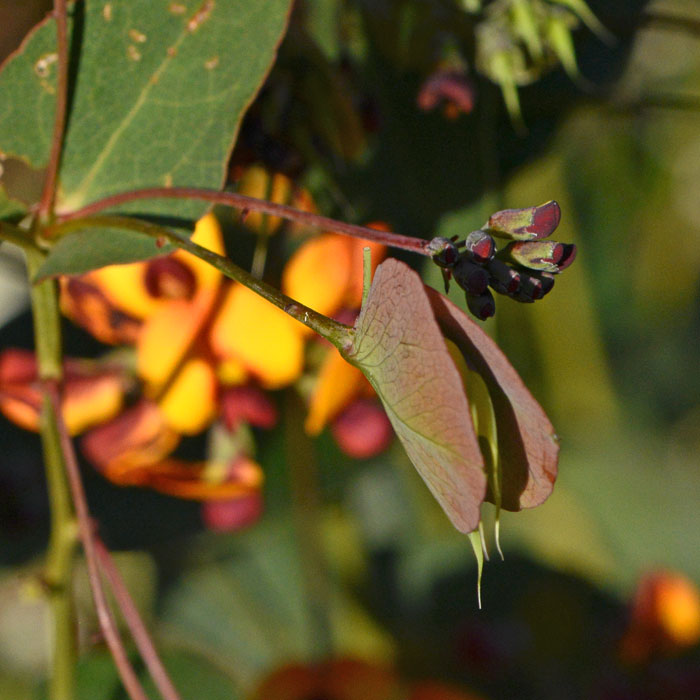 Amplexicaule (no stems), heart-shaped leaves cover this shrub with brilliant orange-yellow and red flowers in bunches at the end of the branches. The flowers can also be red-brown. The common name Bookleaf refers to the large, round, greeny-brown bracts which enclose the triangular fruit of Daviesia cordata.