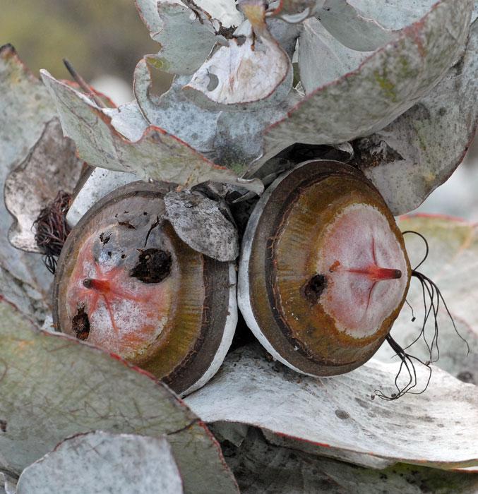 This is one of the most famous of the 500 odd species of Eucalypts which are to be found in Australia because of its very large showy flowers. The foliage is also much admired by gardners because of the large oval leaves which are a slivery grey colour. It can grow to 5 m but we saw plants which were no more than 3 m tall and had few flowers. After flowering it produces equally large nuts (macro = large, carpa = fruit) with a greyish bloom on them.