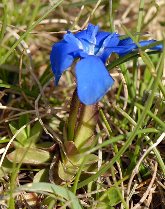 Superficially this Gentian looks very like Gentiana verna which is by far the commonest of the ordinary Gentians seen in and around the Pyrenees. The difference is that the leaves at the base of the flower are short and broad - quite unlike G. verna but identification is tricky when the base of the plant is hidden in the grass.