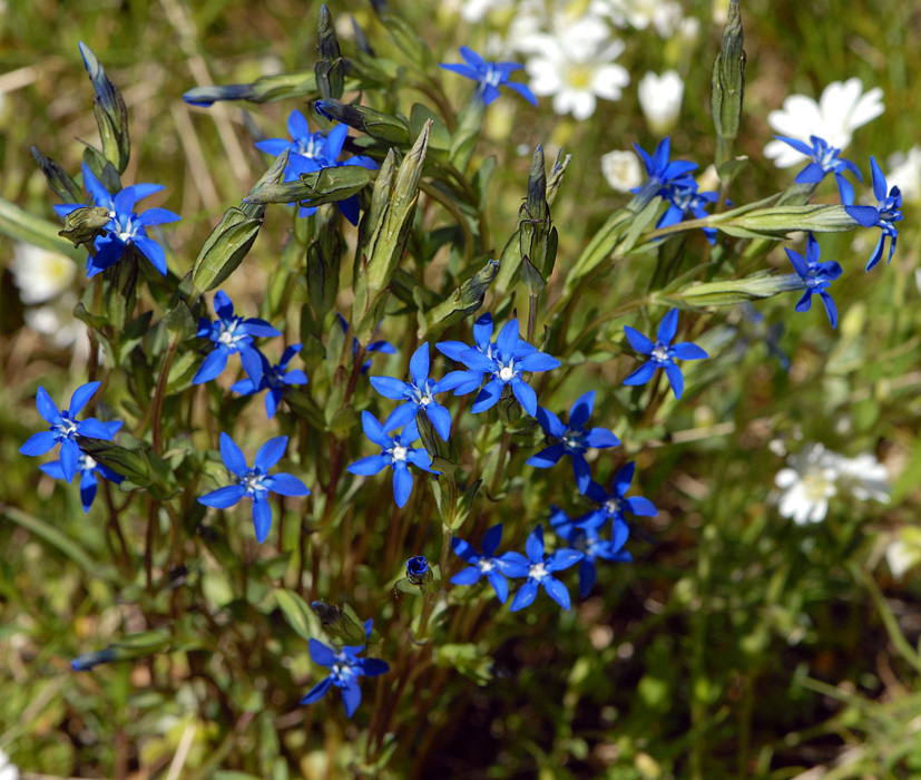 I have seen this plant in flower many times in the corrie of Ben Lawers but these were at least twice as tall as the Scottish gentians and the petals seemed narrower to me. Gentiana nivalis is an annual gentian which must flower and set seed during the quite short time available between snow fall but here in the alps the summer temperature gets up to 30 Celsius fairly often so there is no shortage of insects to pollinate the flowers.