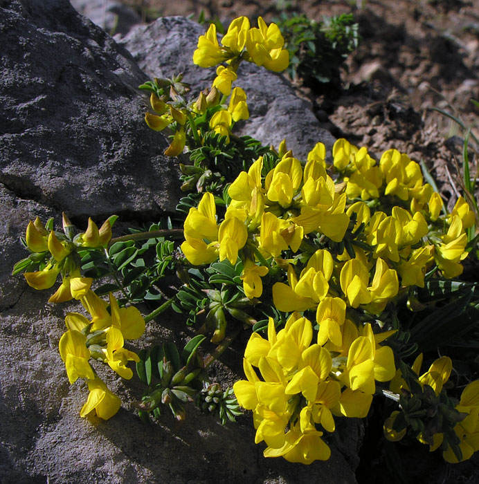 I was about to pass a huge patch of what I thought was Lotus corniculatus (Bird's-foot Trefoil) when it occurred to me that it was just a bit early for such a large amount in full flower and I should take a closer look. Although froma distance the flower colour is similar to that of L. corniculatus, close up you can see the quite different shaped leaves and habit of the plant. It likes dry limestone habitats which exactly describes the rocky cliffs on which it thrives here. It can also flower very early. In 2009 it was in flower on March 3rd after a harsh winter too.