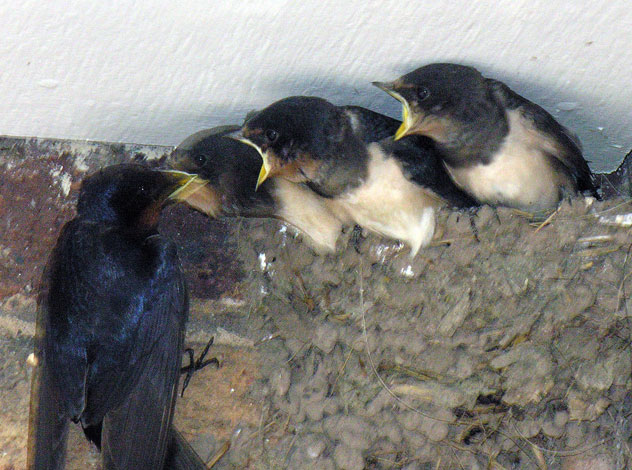 The young swallows were fed by the parents for a week or so but now (June 28th 2006) the parents became busy building a new nest right by the front door of the house.