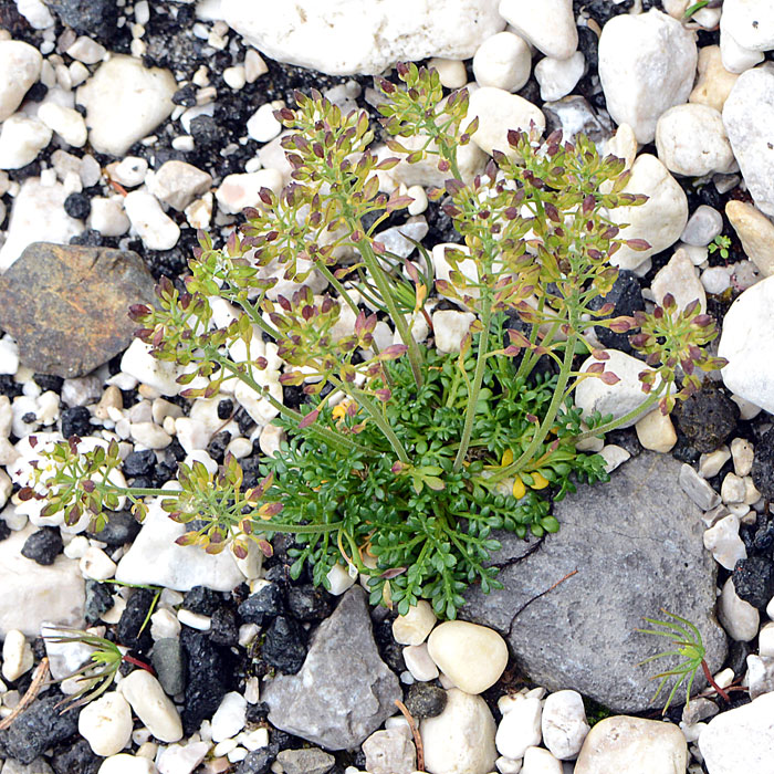 This small usually low growing member of the Brassicaceae family is common in the Alps, Pyrenees, the mountains of northern Spain, central Italy and a few places in the Balkans. The shiny slightly succulent pinnate leaves are typical. It is said to have slightly fragrant flowers.