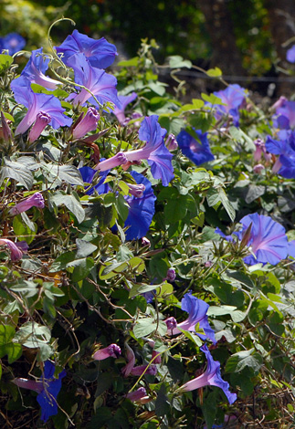 Common Morning Glory is the English name because there are others in this genus with different shaped leaves such as Ipomoea sagittata which has arrow shaped leaves. The flowers of this species are not always purple either, they can also be blue, pink and more rarely white. This particular plant could only be described as rampant as it covered an entire fence, some rough ground and was nearly up to the top of a thirty foot tall tree.