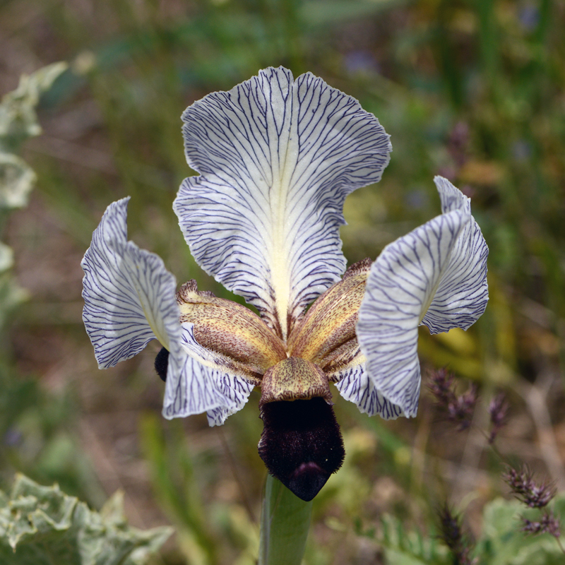 Looking at the close-ups of this particular Iris species, you won't be surprised to find that gardeners are very keen to get hold of it. The flower colours are variable though and the standard (upright petals) can be whitish with distinct darker veins like this one, deep purple, pale blue or even pale yellow while the falling petals can be deep almost black-violet to golden yellow. Irises have been used in herbal medicine since ancient times and sometimes have antiviral and anti bacterial properties. They have even been used to treat cancer.