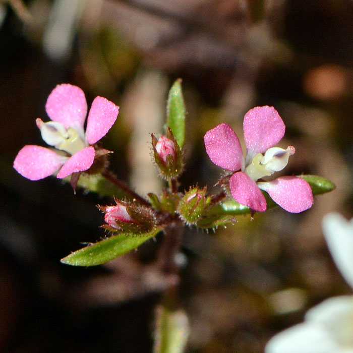 The flower has four obvious pinks petals but also a white structure called a labellum (the fifth petal) which has a sensitive blob on the end.