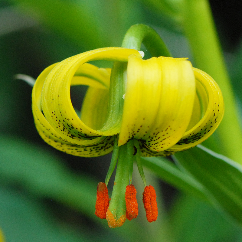 This well known and often grown garden plant is endemic to northern Europe and is also known as Yellow Martagon Lily or Yellow Turk's-cap Lily. There is some confusion between the "Turk's-cap Lilies" such as this and Martagon Lily, Red Lily etc because apart from colour they all have similar unpleasant musty smells and variable leaf widths. It is possible that these lilies, long thought to be separate species are actually more closely related. Molecular biologists - over to you.