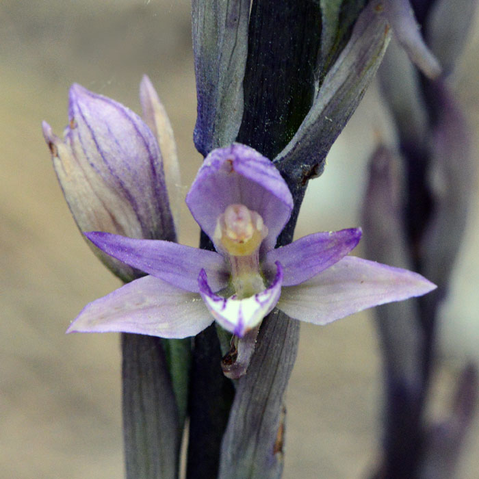 Also known as Violet Bird's-nest Orchid, this plant is often said to be saprophytic i.e. living off decaying matter in the pine woods. It is now pretty certain though that like most orchids this is a myco-heterotroph which means it is parasitic upon the soil fungi which in turn absorb nutrients from decaying matter. It can, if needs be, photosynthesise to a limited extent. Experiments in which fungicide had been used to kill the soil fungus showed that the plant started to photosynthesise to a limited extent. Of course it looks as though it has no chlorophyll but the usual green colouration is masked by the purple anthocyanins which colour this plant making it look a bit like Asparagus when just emerging from the ground.