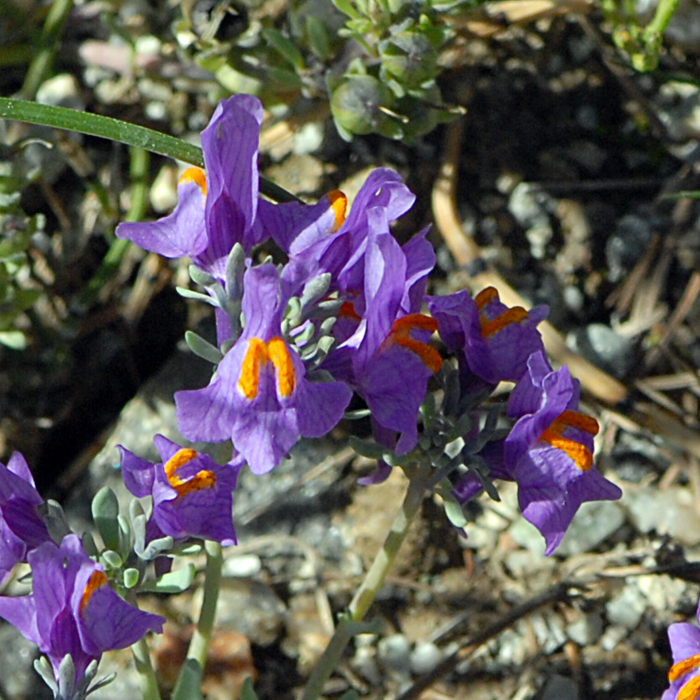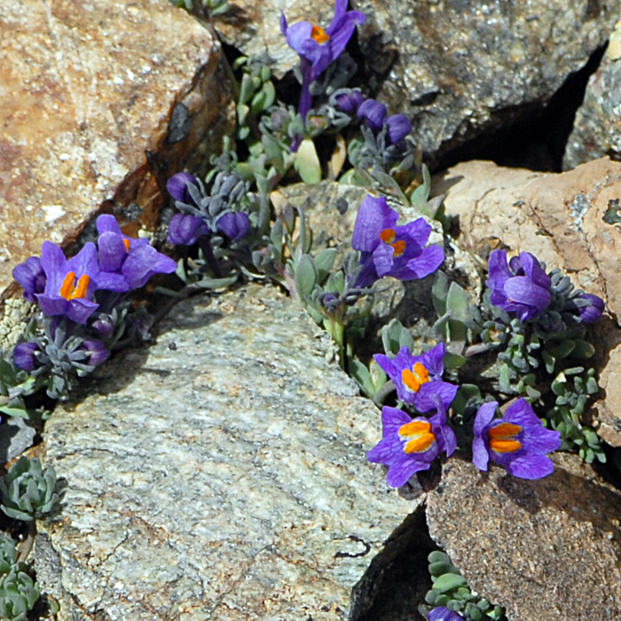 This procumbent, glaucous plant with slightly succulent leaves will grow as high as 12,000 feet and was flourishing at the Summit of Piz Nair - a mere 10,000 feet above sea level in the Alps. At that height it tended to be fairly flat to the ground but at lower altitudes in Pontresina the flower stalks were significant and stood well clear of the matt of leaves. there tend to be two colour forms which grow together. One has distinct orange ridges and the other is pure purple or has very little of the orange colour. The obvious attractiveness of this plant means it is often found for sale as a rock garden plant but is reputed to to be a short lived perennial.