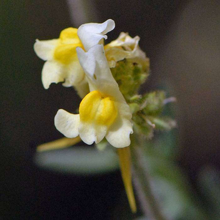A little smaller than our common British Linaria vulgaris (Common Toadflax) but with vaguely similar yellow flowers this plant, usually annual, grows to 6,000 feet in the Pyrenees but can also be found all over Spain and France. The narrow grey green leaves and glandular hairs are typical but it also has veins on the curved spur which characterise many European Toadflax species.