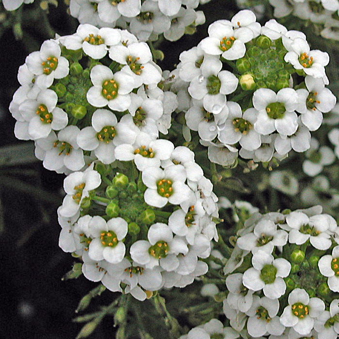 This is a very common garden plant used for edging borders typically with blue lobelia. Over the last thirty years in particular this Southern European introduction has escaped into the countryside and is comfortably naturalised at many seaside sites where it spreads in large mats. The flower heads are usually spherical made up of many tiny crucifer florets. When in full flower you can hardly see the leaves at all.