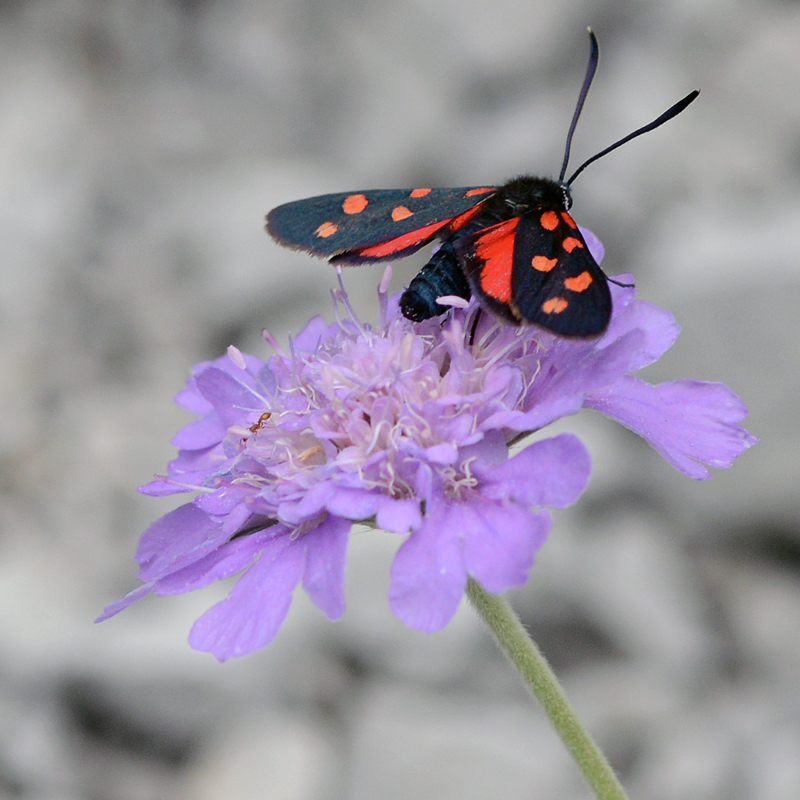 Lomelosia graminifolia Grass-leaved Scabious with Burnet Moth |