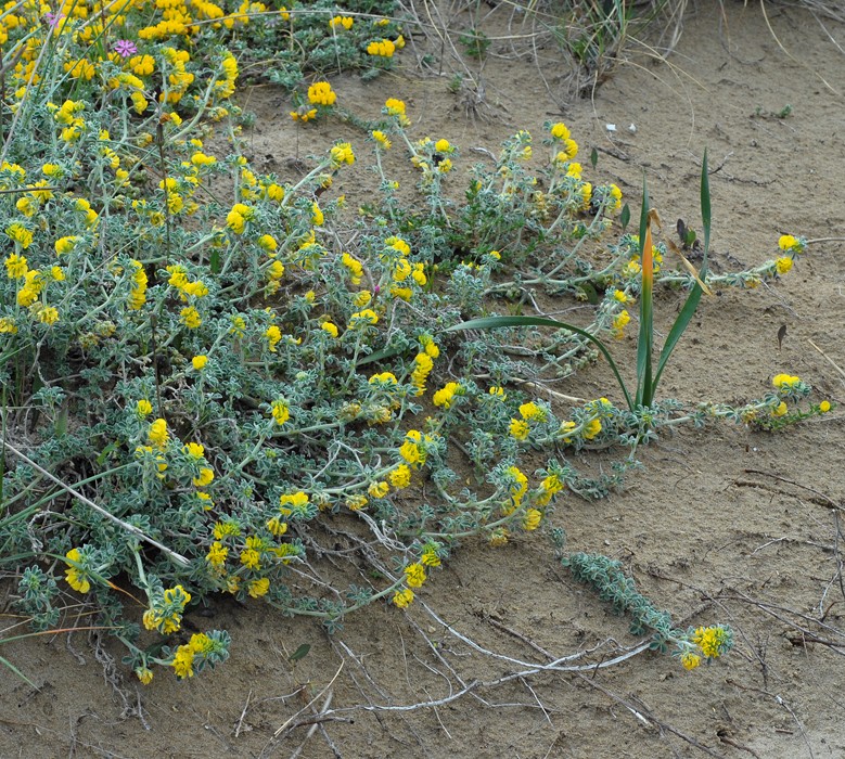 Just below the dune almost on the beach this very hairy procumbent plant was sending out runners mixed with those of the Ononis variegata which has slightly buish green leaves with serrated edges. The hairiness, greysish foliage and procumbent habit are characteristic. It is found at coastal sites throughout the Mediterranean.