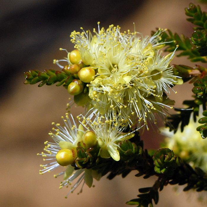This small rounded shrub had distinctive small leaves crowded onto the stem and this characteristic leads to the identification of this plant as the scarce Melaleuca huttensis. It is only found in a few areas around Geraldton and nowhere else in Western Australia.
