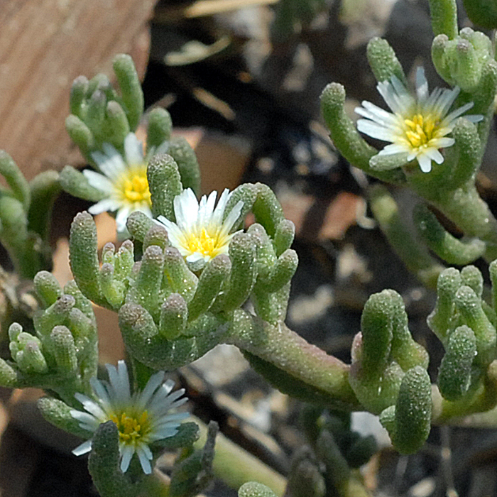 This is an introduced plant native to South Africa. The leaves have the typical crystalline appearance but are slender or finger-like while the flowers are less than a third the diameter of the more familiar relative: Carprobotus edulis (Hottentot Fig).