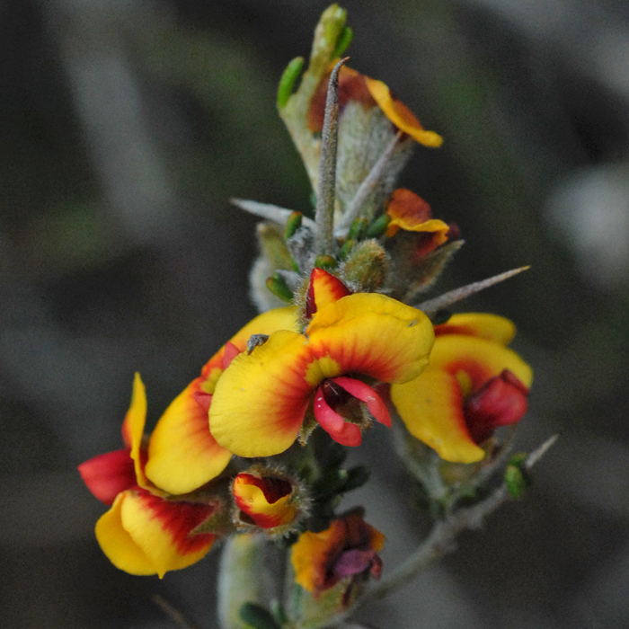 This spiny shrub, whose genus is endemic to Australia, is found mostly near the coastal plain from Kalbarri to Perth but there are some sites like the one here inland in the wheatbelt. The flowers are usually this colour but can also be yellow, orange or brown.