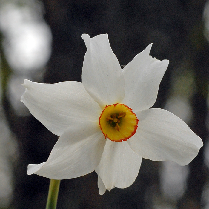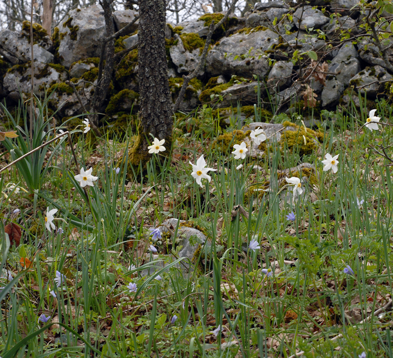 During one of the few respite periods from an unusually rainy week in southern Italy, we came across a semi-cleared area in the forest with dappled shade. Narcissus poeticus was present in the hundreds contrasting with the blue of Anemone apennina. Although very familiar as a garden plant in the British Isles, this is a hill species which will grow in meadows up to 5,500 feet.