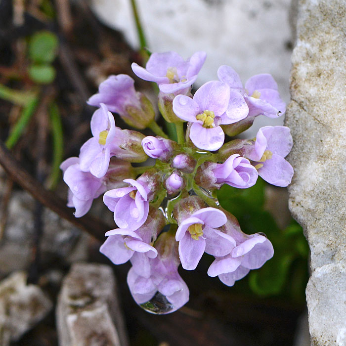 Noccaea rotundifolia is a slightly scented perennial plant which grows on basic rocks and screes and sends out rooting stolons which form new plants. It can be found in the mountains of Germany, Italy, France and Balkan countries from 5,000 to 10,000 feet