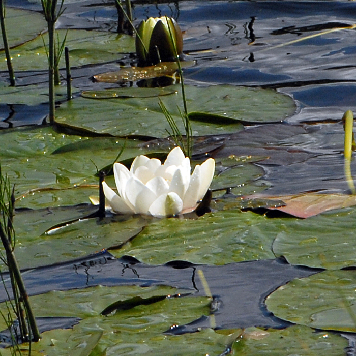 This native water plant can be hard to identify with certainty because many of the waterways and ponds on which it is found are populated by similar looking hybrids of N. alba. In this case the unpsoilt countryside of highland Scotland yielded many natural native species of which this was one. In the fra north of Scotland the smaller ssp occidentalis is also found but these larger more open blooms were ssp alba.