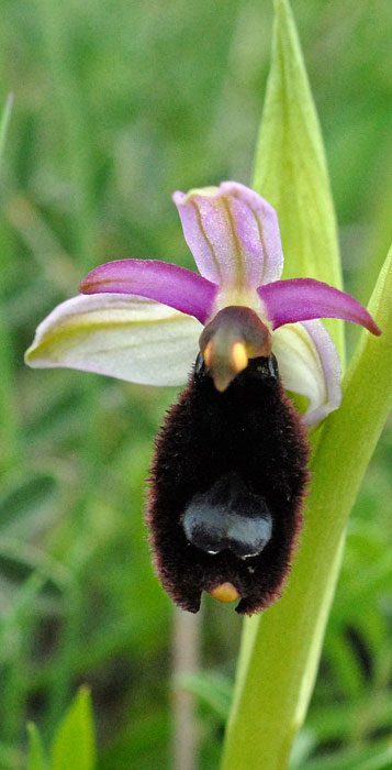 On these hillsides in Italy this was a smallish plant with flowers showing and upwards curvature of the labellum. This arching of the petal is supposed to be an adaptation to specific insects which arch their backs when copulating.
