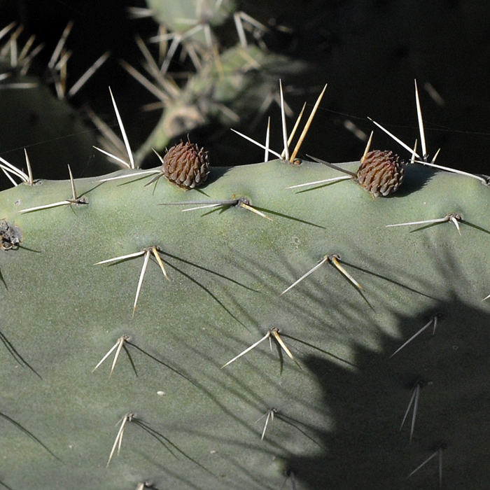 Also known as Opuntia stricta, this north American native has become naturalised in various places with Mediterranean type climates such as Europe, Australia where it is regarded as an invasive weed, and the Canaries. It has distinctly long spines compared with O. ficus-indica (Prickly Pear) but similar yellow flowers and reddish fruits.
