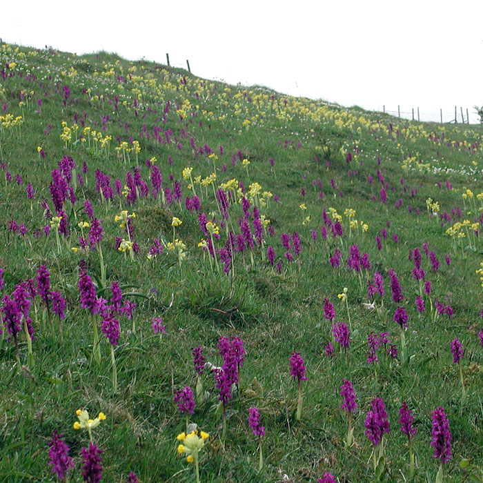 This is a rare occasional orchid here in the acid soils of Cheshire only growing in a few places where basic clay outcrops have been exposed by the river valleys. On basic soils however it can flower in the thousands. If you go in early to mid May the slopes of Derbyshire limestone valleys for instance, you will see Orchis mascula (Early-purple Orchid), Primula veris (Cowslip) and Anemone nemorosa (Wood anemone) flowering at the same time. It is one of the most spectacular wild flower sights in the UK.