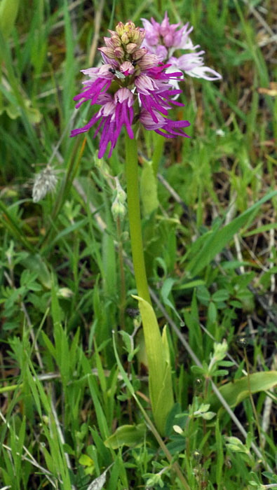 On a hillside field where Orchis italica (Naked Man Orchid) was more than abundant we were shown this excellent example of the hybrid between Orchis italica (Naked Man Orchid) and Orchis anthropophora (Man Orchid). The composite photograph above shows the hybrid in the centre with O. anthropophora on the left and O. italica on the right.