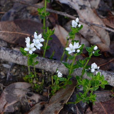 A member of the Loganiaceae family, until recently this species was named Logania serpyllifolia. There are two subspecies Orianthera serpyllifolia subsp angustifolia and Orianthera serpyllifolia subsp serpyllifolia. It is an inconspicious plant but quite common with records from just south of Perth, to much of the extreme south-west corner around Margaret River then along the south coast to Fitzgerald River National Park.