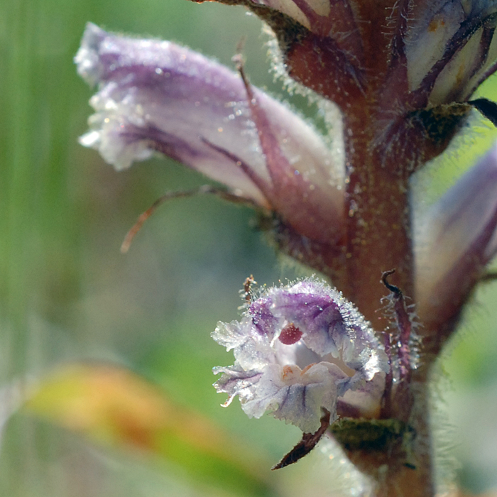 This is an introduced species in western Australia and at first it was thought to be Orobanche cernua var australiana. O. cernua and O. ramosa do grow in Australia but not in Western Australia and the purplish colour of the flowers are unusual compared with the more browny colours in the UK. However colour of the main plant isn't much of an indication of identity in Orobanche species as indicated in book by C.A.J. Kreutze who says O. minor can be: red-brown, violet-purple, yellow-brown or brownish tinged with red rarely yellow-brown. This one is certainly densely glandular hairy.