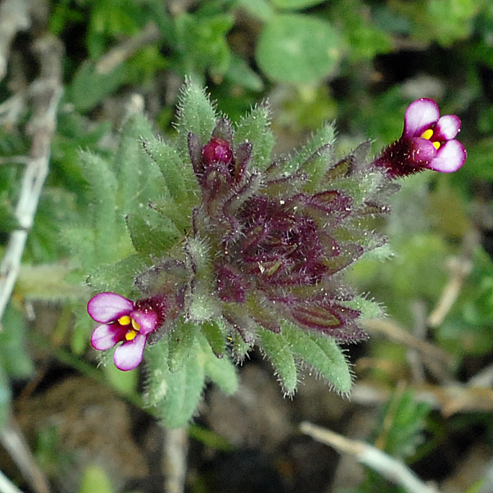 This is a tiny plant and like its close relation Parentucellia viscosa (Yellow Bartsia) is covered in glandular hairs making it quite sticky. It is also known as Red Bartsia in the US which would be confusing for us in the British Isles because use that name for Odontites vernus. P. latifolia grows throughout the Mediterranean in grassy or stony places.