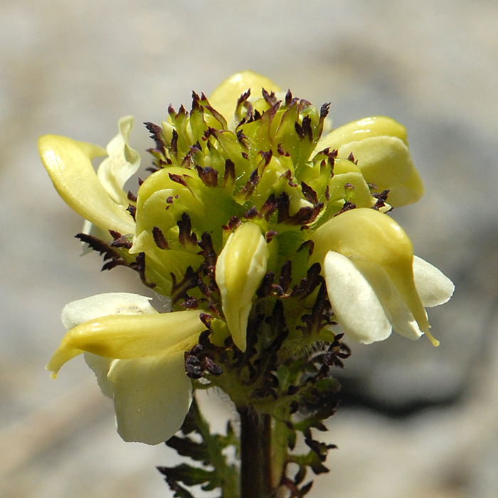 Described as low growing in one text, this was in fact one of the taller Louseworts we found high in the Swiss Alpine meadows. It has dense heads of flowers with short bracts and a long upper petal or beak and grows in thr Alps, Pyrenees and Apennines at heights of up to 9,500 feet.