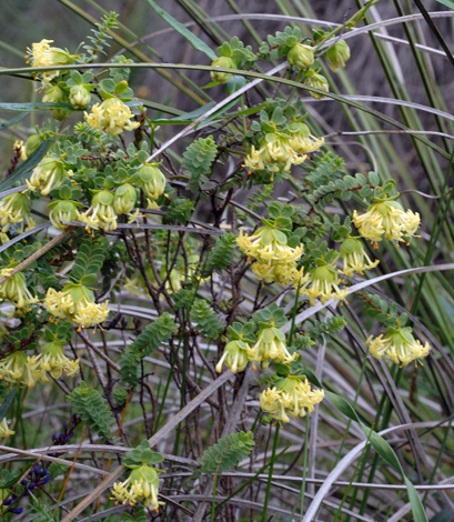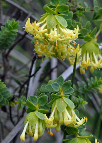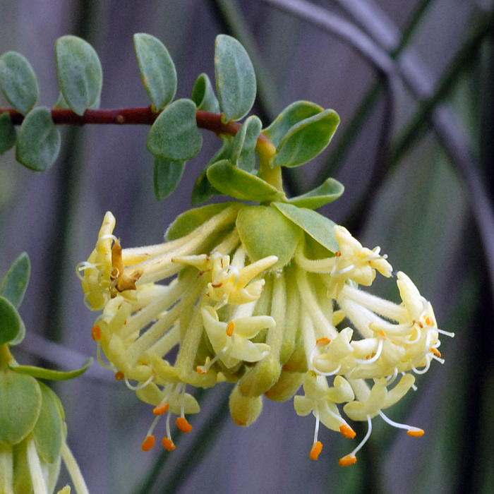With a rather faint sweet fragrance, this shrub is described as "Spindly" in Florabase but the specimen photographed seemed quite robust to me. The flowers are always this pale yellow colour with light green sepals giving it an overall yellowy-green effect. It is used as a source of fragrance for essences and is sold as a garden plant.