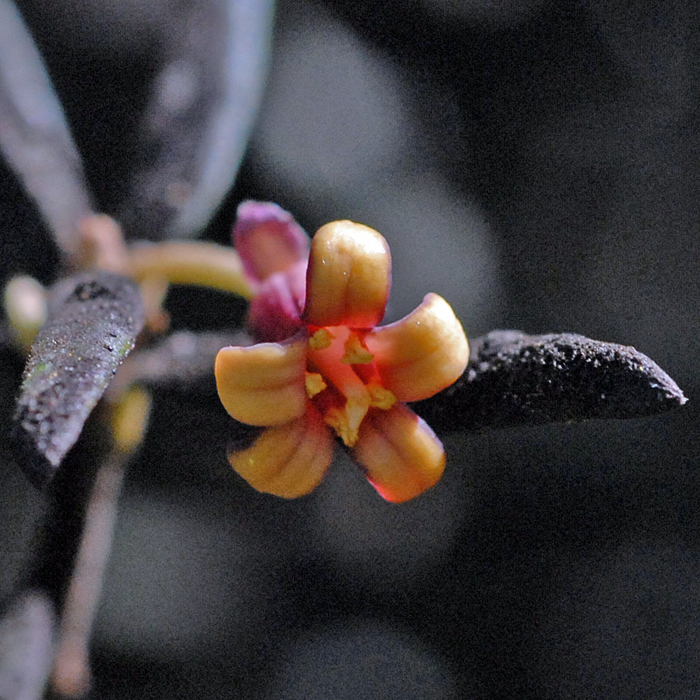 Pittosporum species are native all over Australia but this one is most often found in New South Wales and Tasmania. It grows in the hills within temperate rain forest on the mainland but in Tasmania we found it at sea level on an island in the middle of the Gordon River. The species name bicolor refers to the leaves which are slivery underneath. The English name Cheesewood refers to the texture of the wood when freshly cut.
