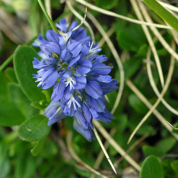 This small procumbent plant can be dark blue like this or a lighter colour. The leaves are said to be longer and almost linear compared with other milkworts but to my eyes they look about the same shape. P. alpina will grow at heights of between 5,000 and 10,000 feet usually on basic soils such as limestone areas provide.