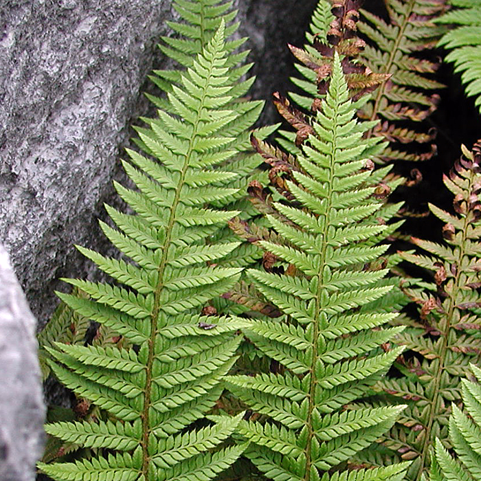 To distinguish this from P. setiferum (Soft Shield Fern) you touch it to see if it is stiff and look for the older fronds from the previous season. Both have the little pinule sticking out the base of the frond towards the rachis (central stalk in a fern) as can be seen in the close photographs.