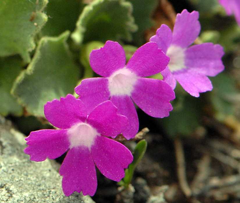 Three purple/pink Primula species which are not uncommon in the Alps or the Pyrenees are distinguished by their leaves rather than their flowers. The leaves of this plant which you would expect to be called Hairy Primrose, have short hairs and have a few large blunt teeth towards the tip. Primula hirsuta grows in the Alps and Pyrenees and can be found even at heights of 12,000 feet. Cultivars of this species are available from garden centres and Alpine specialists.