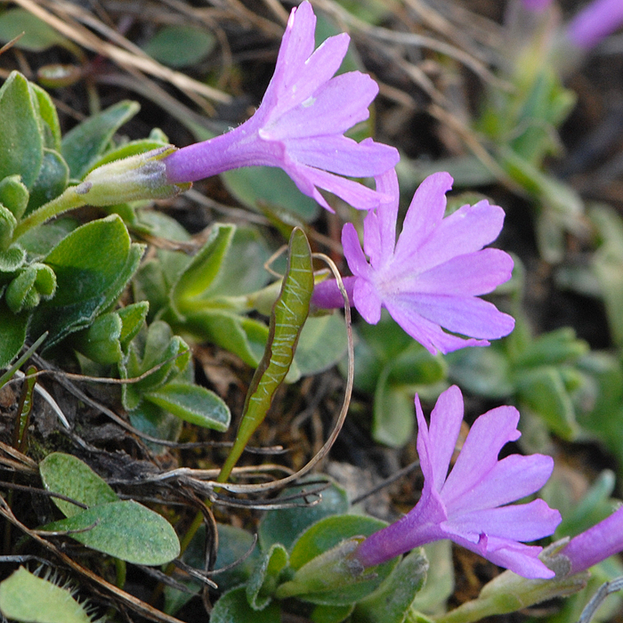 Primula integrifolia is a low growing plant the leaves of which have no serrations. It can be lilac pink as in the close-up photos or a deeper purple as in the habitat shot where thousands of these Primroses carpeted the stony plateau of this mountain in the Engadine region of the Swiss Alps.